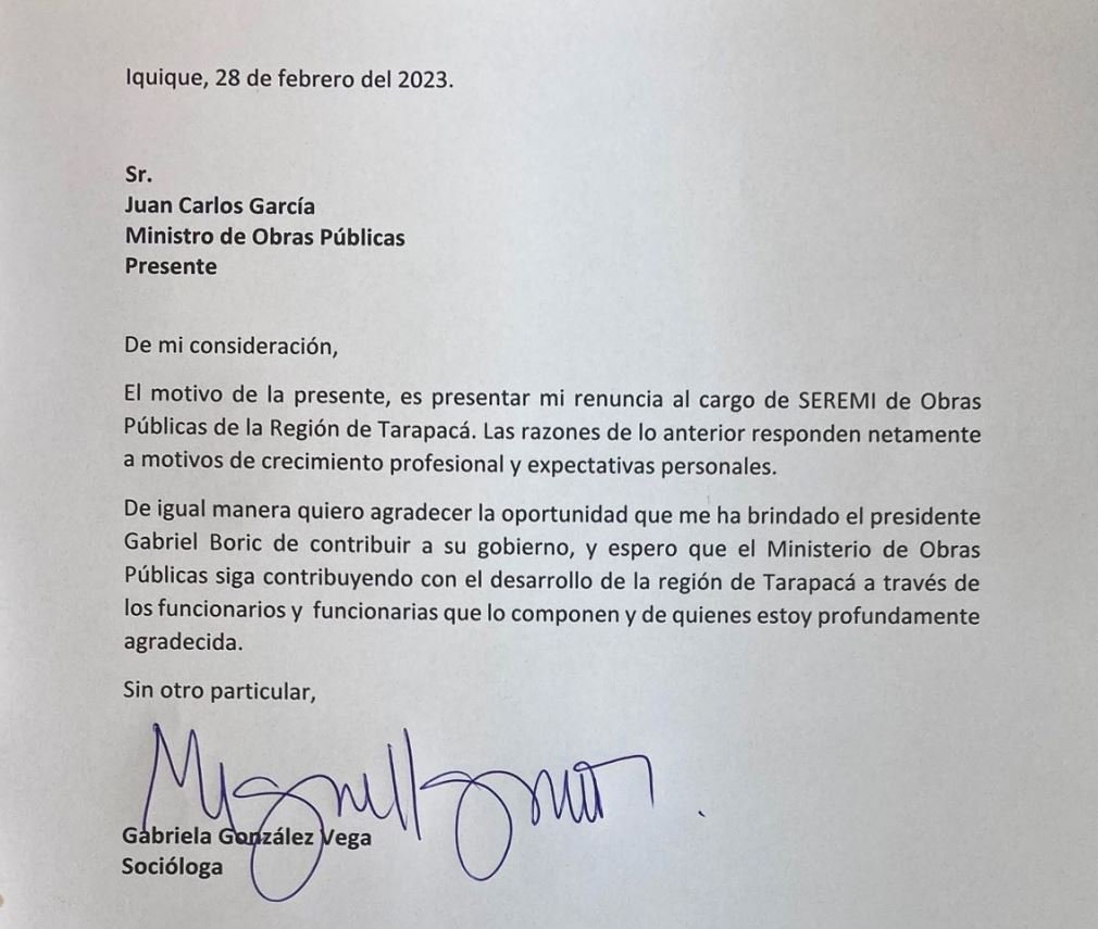 La jornada de este martes, la seremi de Obras Públicas de Tarapacá, Gabriela González Vega, presentó su renuncia al cargo, esta resolución la realizó mediante una carta dirigida al ministro del Ministerio de Obras Públicas, Juan Carlos García.