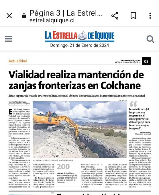 La Secretaría Regional Ministerial (Seremi) de la cartera de Obras Públicas (MOP) en Tarapacá revivió una antigua polémica tras compartir un video en la red social X, en el que se mostraba una retroexcavadora trabajando en la excavación de una zanja en Colchane. El mensaje indicaba que personal de Vialidad estaba llevando a cabo trabajos de excavación y construcción de pretiles en el complejo fronterizo, con el fin de apoyar la seguridad nacional.