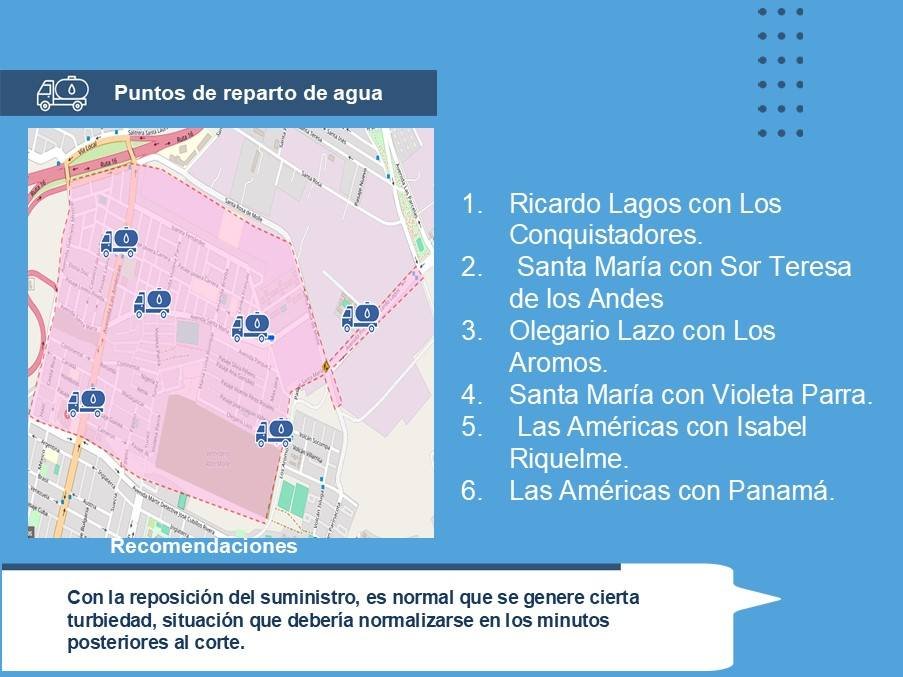 Agregó que, para la jornada de este martes, se dispondrá de seis puntos de distribución de agua potable alternativos, los cuales estarán ubicados en avenida Ricardo Lagos con Los Conquistadores, Santa María con Sor Teresa de los Andes, Olegario Lazo con Los Aromos, Santa María con Violeta Parra, Las Américas con Isabel Riquelme, y en avenida Las Américas con Panamá.
