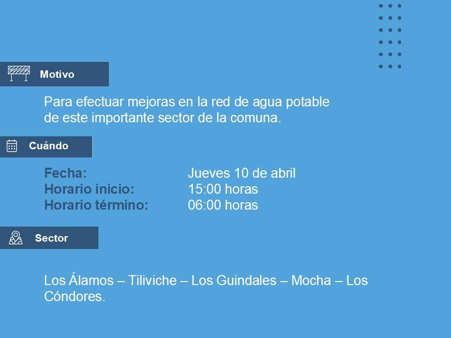 Respecto de la segunda jornada, precisó que los trabajos se llevarán a cabo contar de las 15:00 este jueves 10 de abril y se extenderá hasta las 06:00 horas de la jornada siguiente, abarcando el cuadrante conformado por Los Álamos, Tiliviche, Los Guindales, Mocha y avenida Los Cóndores, con un total de 205 clientes asociados a esta suspensión programada.