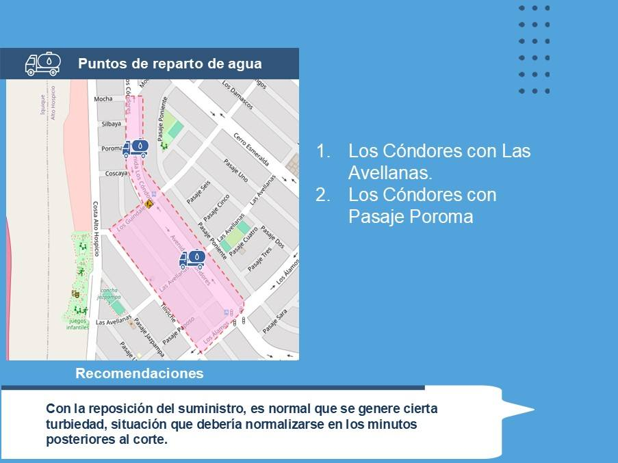 Para esta segunda jornada se habilitarán dos puntos de distribución de agua potable alternativos los cuales estarán ubicados en avenida Los Cóndores con Las Avellanas y en avenida Los Cóndores con Pasaje Poroma. Cualquier duda o consulta, pude canalizarse a través del Call Center 600 600 9900 o a través de la página web www.aguasdelaltiplano.cl.