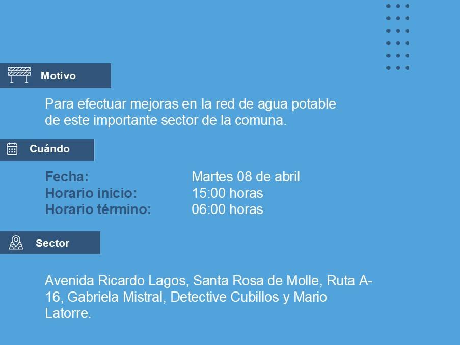 Según informó Francisco Montero Lillo, Jefe de la Unidades de Redes de Agua Potable de Alto Hospicio, los primeros trabajos se realizarán este martes 8 de abril, a contar de las 15:00 horas y se entenderán hasta las 06:00 horas de la jornada siguiente, abarcando el cuadrante conformado por avenida Ricardo Lagos, Santa Rosa de Molle, Ruta A-16, Gabriela Mistral, Detective Cubillos y Mario Latorre, con un total de 2.659 clientes asociados a esta suspensión programada.