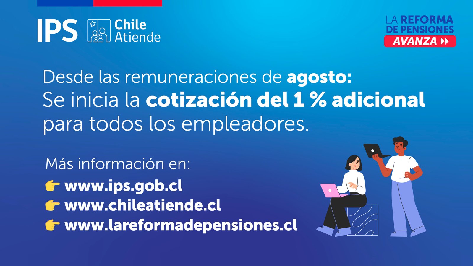 La Reforma de Pensiones avanza. Así, a partir de agosto, todos los empleadores deberán contemplar un 1 % adicional de cotización sobre las remuneraciones imponibles de sus trabajadores y trabajadoras, cuyos pagos se deben realizar hasta el 13 de septiembre si se efectúan de manera electrónica a través de Previred.