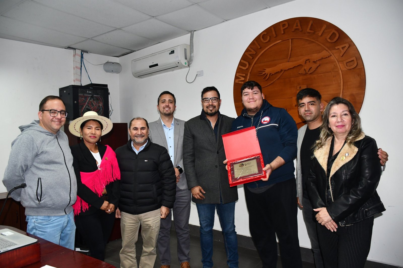 Alcalde Patricio Ferreira junto al Cuerpo de Concejales, en sesión de Concejo Municipal, entregan reconocimientos a deportistas hospicianos formados en las Escuelas Deportivas Formativas Municipales, que triunfaron en Juegos Panamericanos Junior realizado en Asunción, Paraguay.