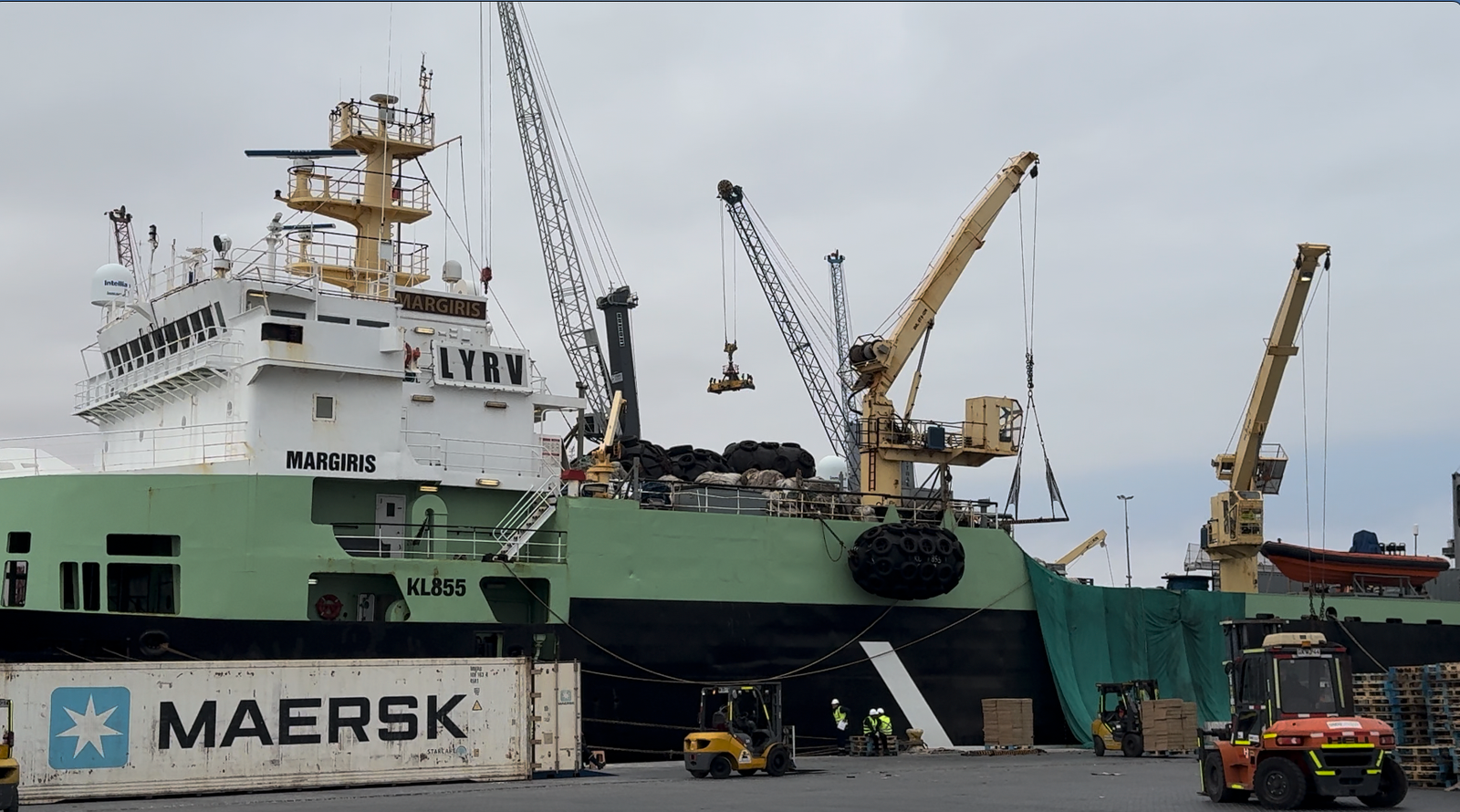 La carga proveniente del Margiris —principalmente compuesta por pesca procesada y congelada, específicamente jurel y caballa, capturada en aguas internacionales— será consolidada en contenedores y exportada hacia África, reafirmando la vocación exportadora y la conectividad internacional del recinto portuario.