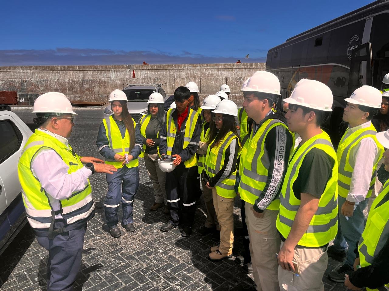 Durante la jornada, los alumnos del 4° Medio C participaron en una presentación teórica sobre la historia, operaciones y desafíos del Puerto de Iquique, para luego realizar una visita a terreno que les permitió conocer de cerca las instalaciones portuarias y comprender la relevancia que tiene este enclave en la cadena logística y comercial del norte del país.