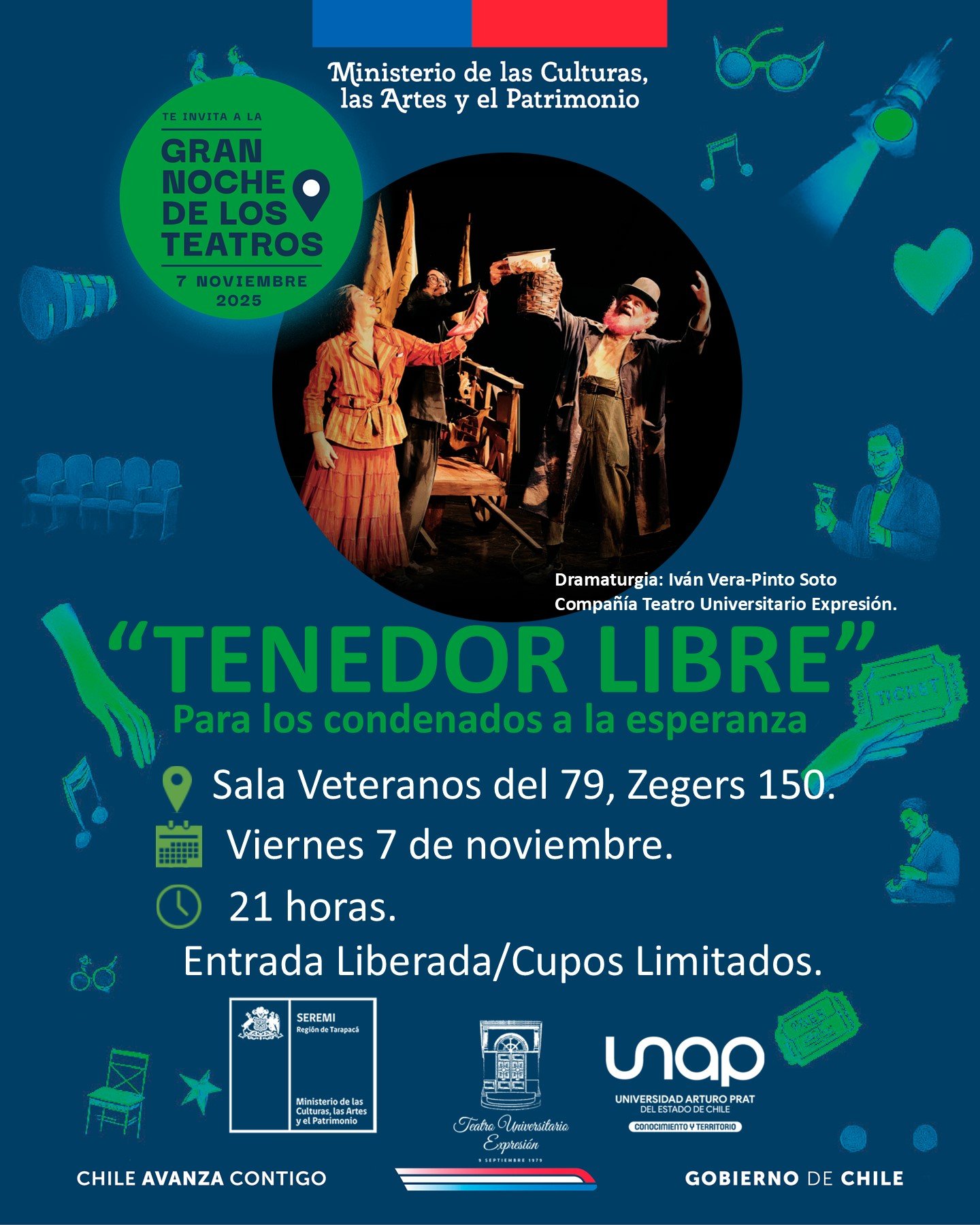 Una oportunidad para que la comunidad pueda acercarse y disfrutar de las tablas es la que realiza la Seremi de las Culturas, las Artes y el Patrimonio, con la realización de la iniciativa “Noche de los Teatros”, una actividad que se replicará en todo el país y que busca activar distintas salas del territorio nacional. En Iquique se presentará la obra «Tenedor Libre, para los condenados a la esperanza», la cual cuenta con dramaturgia de Iván Vera Pinto, de la Compañía Teatro Universitario Expresión.