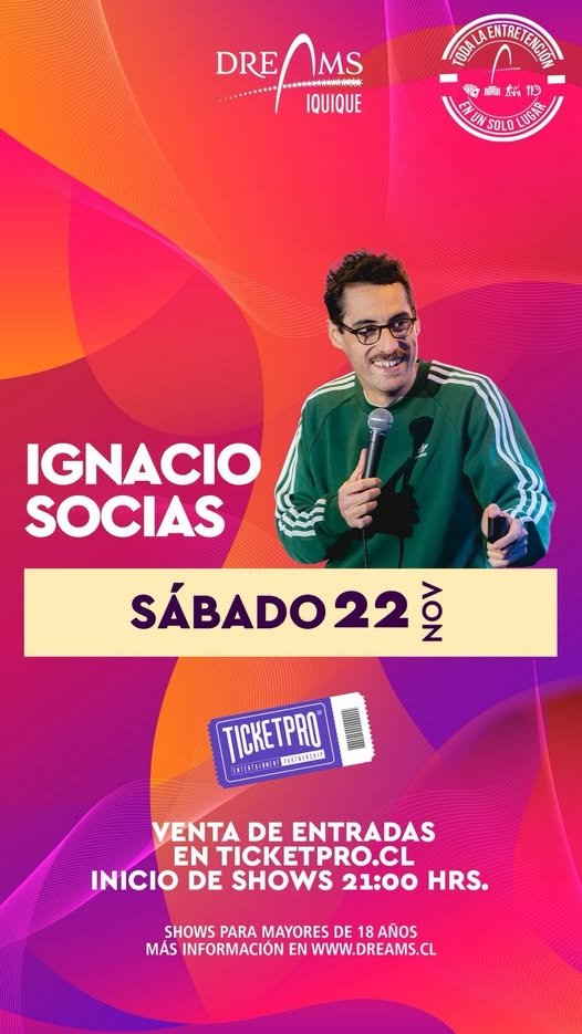 El comediante Ignacio Socías continúa recorriendo Chile con su exitosa gira “Comiendo Oreja”, que lo ha llevado de Arica a Punta Arenas y que ahora tendrá una parada especial en Dreams Iquique, el próximo sábado 22, desde las 20:00 horas.