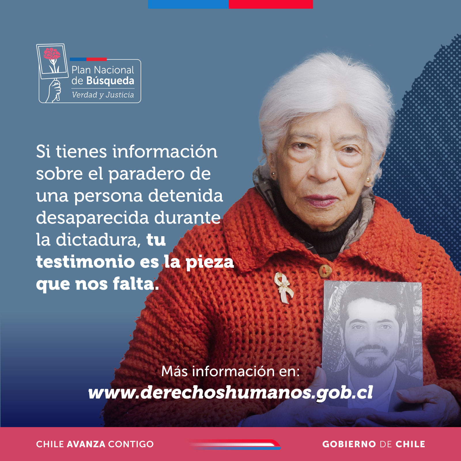 Por lo anterior, el llamado del Gobierno es a colaborar con información que permita esclarecer las desapariciones forzadas ocurridas entre 1973 y 1990, ingresando al enlace derechoshumanos.gob.cl/ColaboraPorVerdad