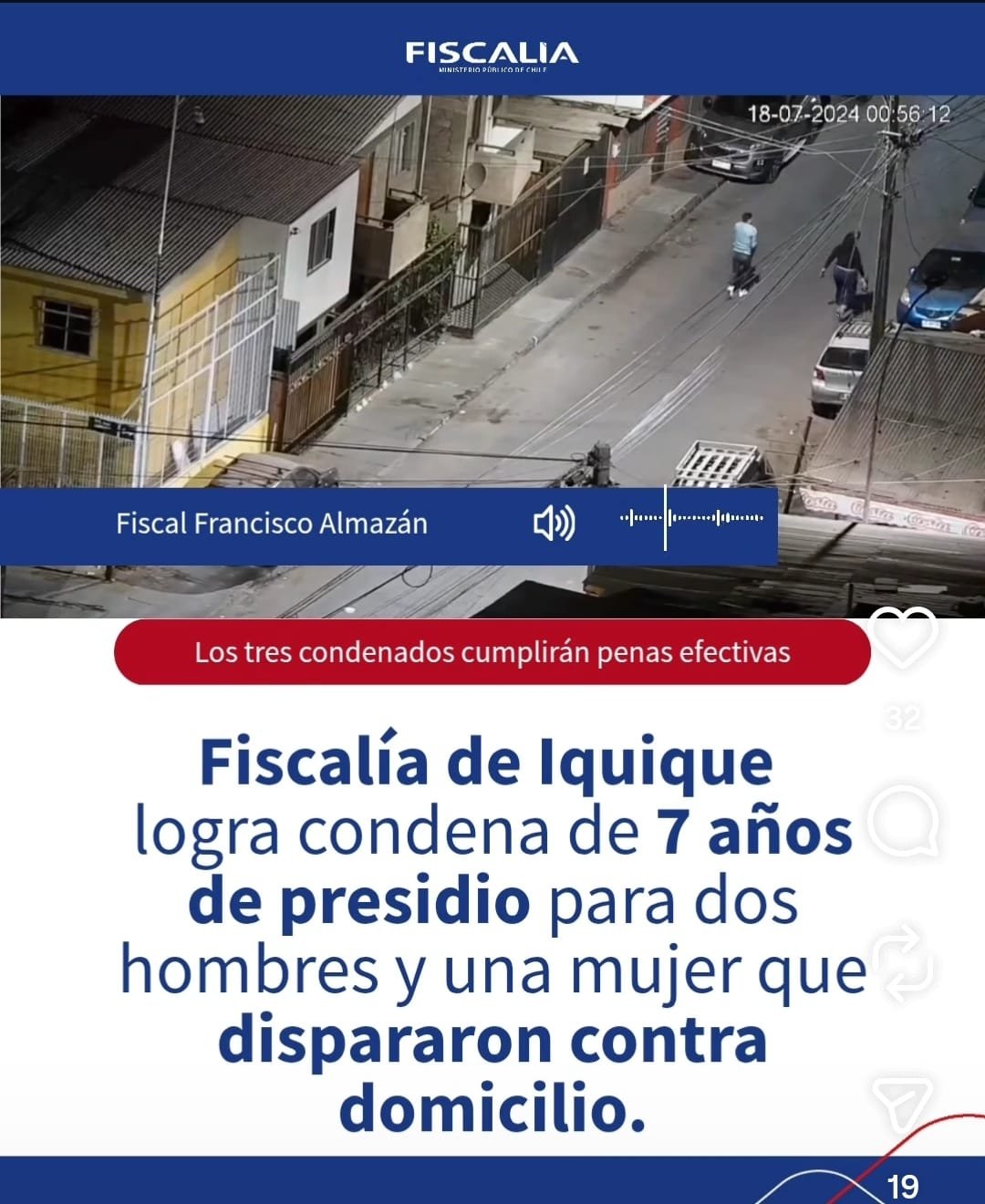 Terminado el juicio y considerando que, si bien un acusado fue quien materialmente disparó, todos participaron en la ejecución de los hechos que buscaban amedrentar a las víctimas; el tribunal resolvió condenar a cada uno de los acusados a las penas efectivas de 4 años y 3 años y un día de presidio, como autores de los delitos de disparos injustificados en la vía pública y de porte ilegal de arma de fuego, además de una multa de 11 UTM por el delito de daños.