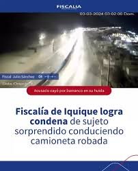 En el juicio oral a cargo del fiscal Julio Sánchez se acreditó que, en la madrugada del 3 de marzo del año 2024, funcionarios de Carabineros de la Sección de Investigación Policial, previamente coordinados por la Central de Cámaras de la Municipalidad, realizaron una persecución a una camioneta, marca Toyota, modelo Hilux, color rojo, la cual había sido objeto de un robo en la vía pública durante la misma noche. En el seguimiento, a la altura de calle Sotomayor con Avenida Circunvalación de Iquique, el acusado de iniciales J.O.H.A., que iba de conductor, se bajó del móvil en movimiento y luego saltó un cierre perimetral de un edificio, cayendo por un cerro cercano por el sector de La Cantera, siendo detenido por los agentes policiales.