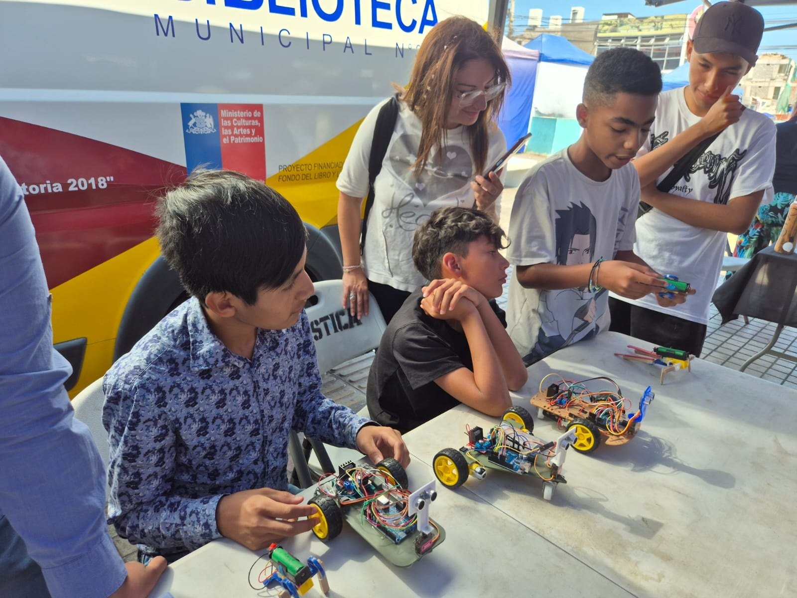 Niños y jóvenes en el cierre del Taller de Robótica impartido por el municipio a través de la Biblioteca Pública Municipal 305 de Alto Hospicio muestran sus creaciones al público en la explanada del Gimnasio Techado Municipal.