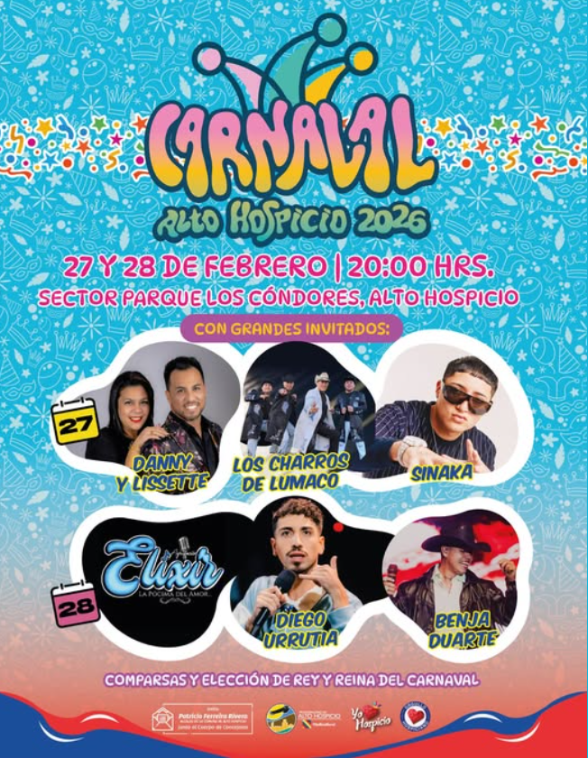 El Carnaval 2026 organizado por el municipio encabezado por el alcalde Patricio Ferreira junto al cuerpo de concejales, se realizará los días 27 y 28 de febrero, desde las 20.00 horas, en el Parque Los Cóndores. El evento gratuito incluirá espectáculos musicales, presentaciones de humor, la competencia de comparsas y la elección de las candidatas y candidatos a reyes del Gran Carnaval.