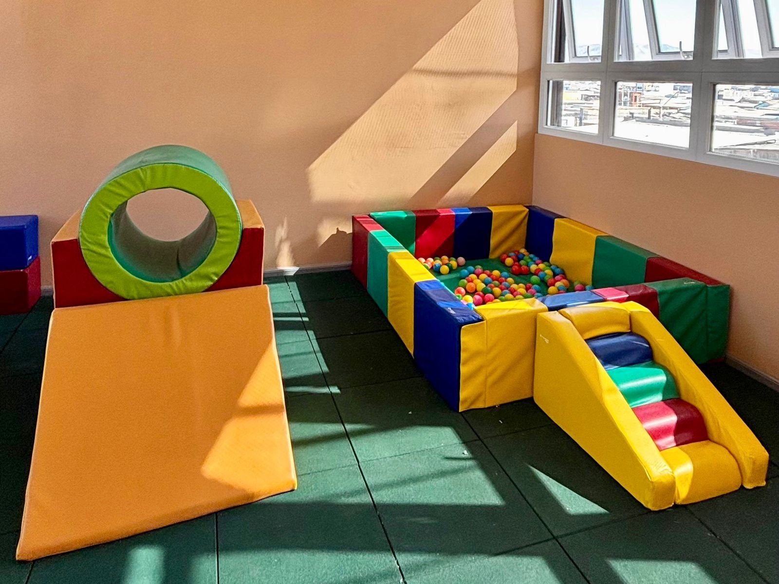 La sala cuenta con diversos materiales y recursos especializados, entre ellos implementos sensoriales y módulos acolchados para el desarrollo de la motricidad gruesa, que permiten a niñas y niños desplazarse, explorar y fortalecer sus habilidades motoras en un entorno seguro y diseñado para su etapa de desarrollo.
