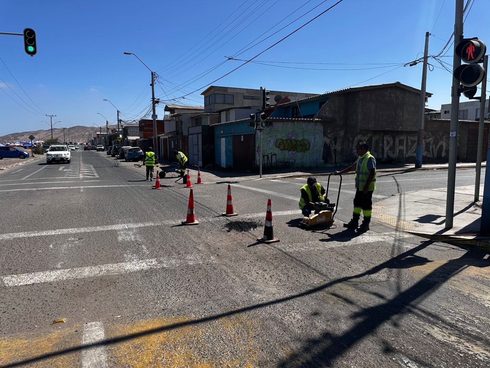 Municipalidad de Alto Hospicio a través de la Dirección de Tránsito continúa realizando labores de mantenimiento vial preventivo: Bacheo y demarcación vial en distintas calles y avenidas de la comuna.