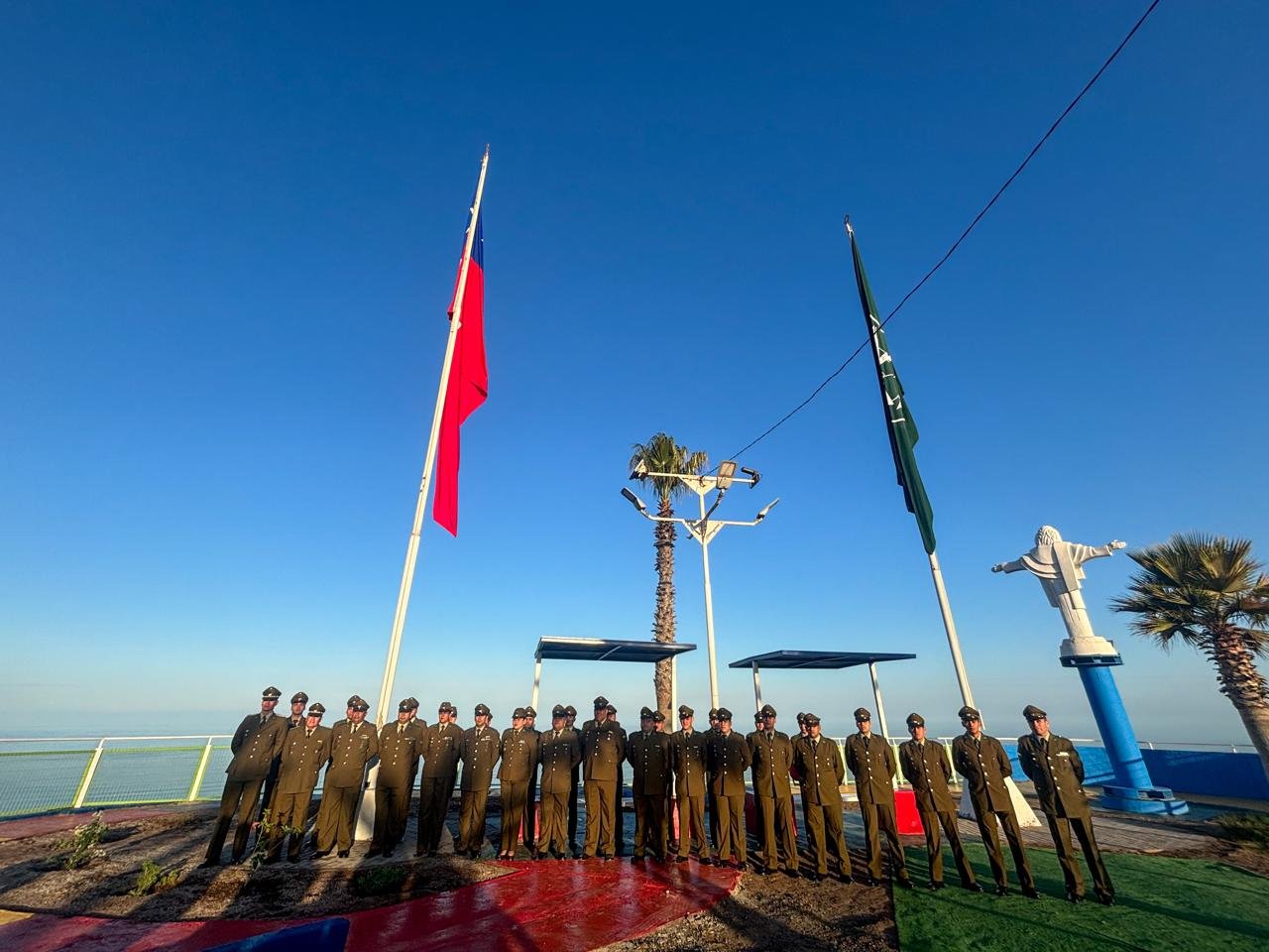En el mirador de Alto Hospicio se realizó la ceremonia de izamiento del pabellón de Carabineros de Chile, marcando el inicio del mes institucional en el contexto de su 99° aniversario (Carabineros de Chile fue fundado el 27 de abril de 1927).