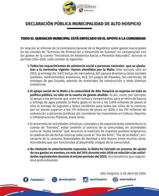 En relación al informe de la Contraloría General de la República sobre gastos municipalesen las cuentas de “Servicios de Producción y Desarrollo de Eventos” en comparación conlos gastos de la cuenta “Iniciativas de Asistencia Social a Personas Naturales”, durante elperíodo 2024-2025, cabe señalar lo siguiente: